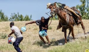 Del Rio,Texas, September 2021. A U. S. Border Patrol agent snatches a Haitian refugee. Planeloads of such refugees, crowded under a nearby bridge, are being deported to Haiti. Their Caribbean homeland has been rocked by the assassination of the president, a major destructive earthquake, and generations of corruption and poverty.