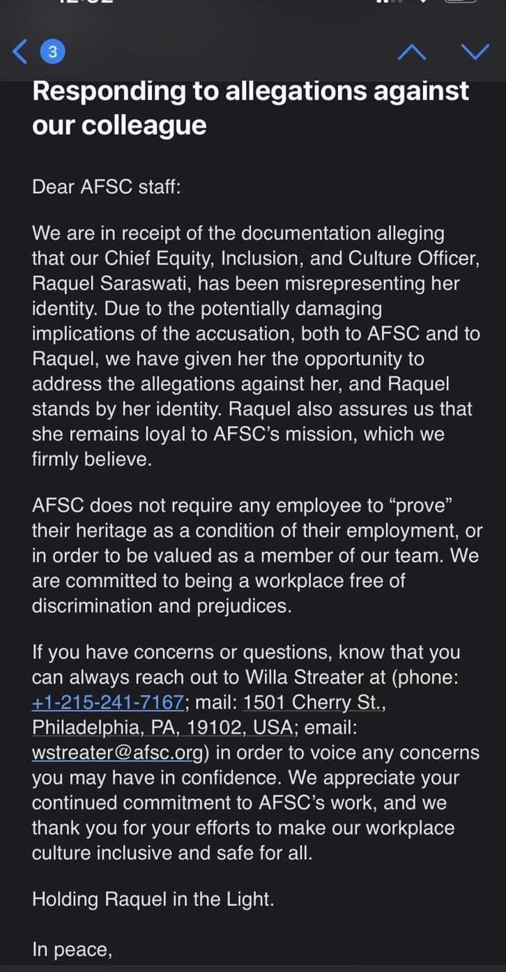 For those following the unrest in AFSC headquarters about the identity & status of its DEI Director Raquel Saraswati (previously blogged about here ), a clarifying email came in late Friday from AFSC staffer Layne Mullett. In it, Mullett answered the two big questions: