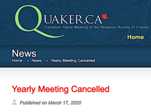 Tuesday March 17, Canadian Yearly Meeting (CYM) posted a notice that its 2020 Annual Session, set for August 7-15 in Winnipeg, has been cancelled.