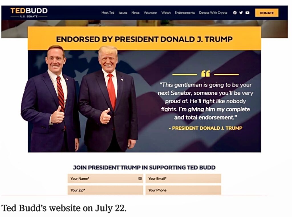 Until July 22, [Budd’s] home page featured a prominent, all-caps message that read “endorsed by President Donald J. Trump,” above a photo of Mr. Budd with the former president and a sign-up form urging voters to “join President Trump in supporting” him.