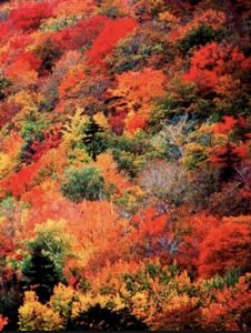 In the morning, I went outside, looked around, and reeled back in astonishment. I had never seen New England autumn foliage before, and the hillsides and even trees nearby all seemed alight with a kind of psychedelic aura that was almost audible, mezzo-piano purples, operatic orange, fortissimo red and a crescendo of yellow, an ensemble so overwhelming it seemed like it must surely be illegal.
