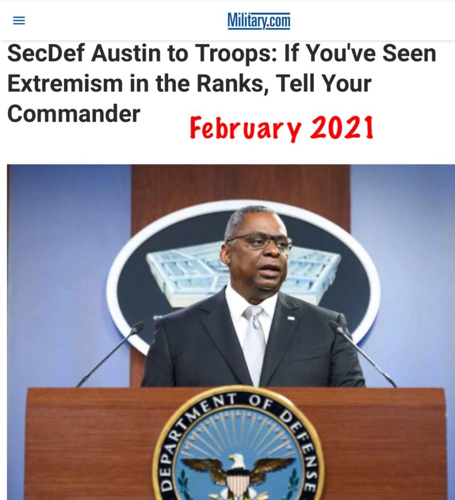 Anybody remember this story? RELEASE IMMEDIATE RELEASE DOD Stand-Down to Address Extremism in the Ranks Feb. 5, 2021 Today, Secretary of Defense Lloyd J. Austin III signed a memo directing commanding officers and supervisors at all levels to select a date within the next 60 days to conduct a one-day “stand-down” to discuss extremism in … Continue reading You Could See It Coming — CNN: Army ABANDONS anti-extremism effort