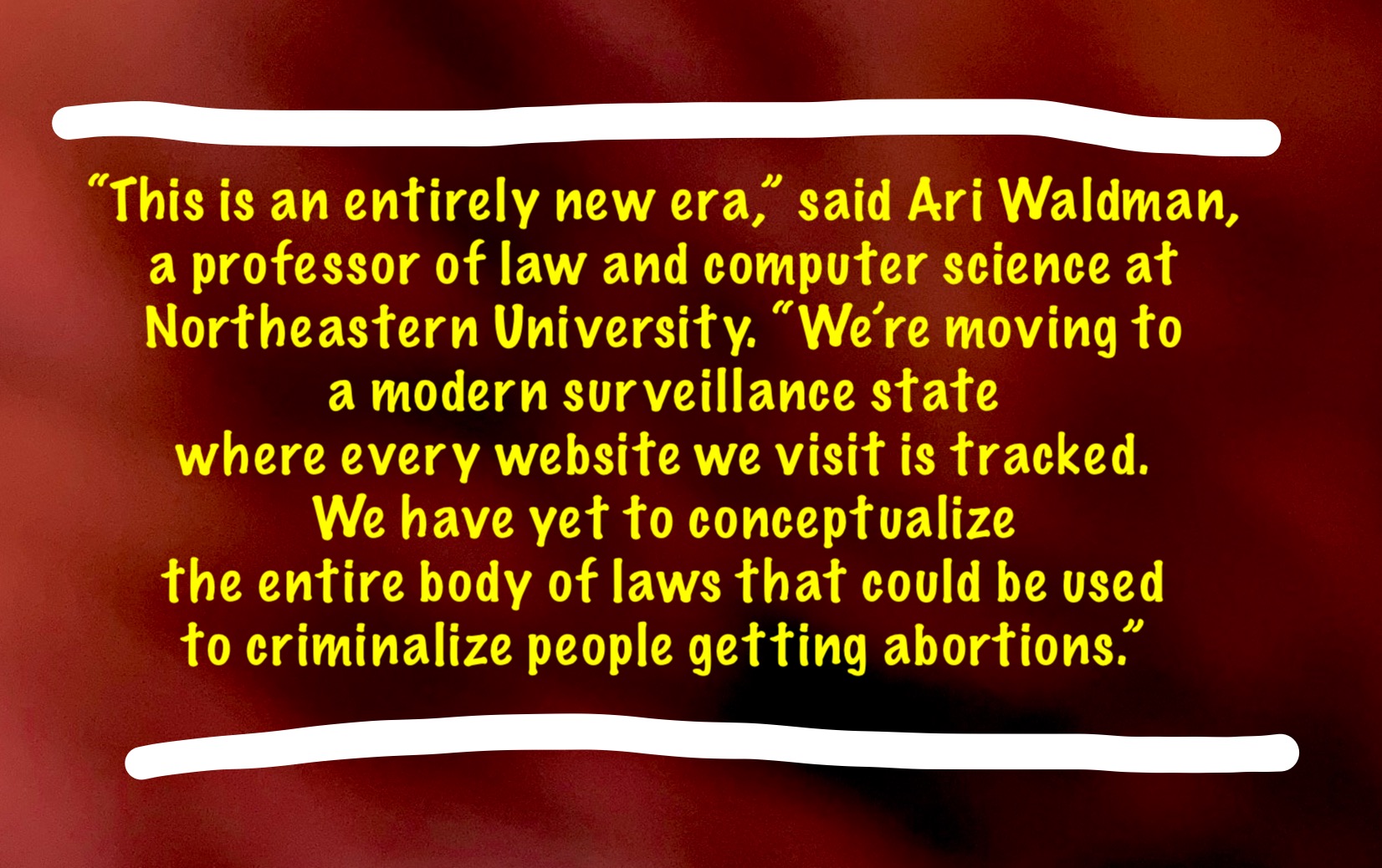 “This is an entirely new era,” said Ari Waldman, a professor of law and computer science at Northeastern University. “We’re moving to a modern surveillance state where every website we visit is tracked. We have yet to conceptualize the entire body of laws that could be used to criminalize people getting abortions.”