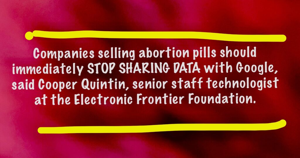 Companies selling abortion pills should immediately stop sharing data with Google, said Cooper Quintin, senior staff technologist at the Electronic Frontier Foundation.