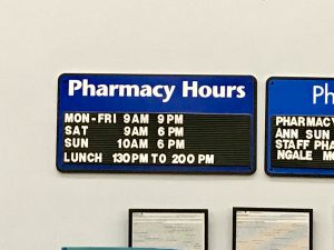 A pharmacy clerk comes in view, stepping from behind the long rack where dozens of plastic bags holding filled prescriptions are hanging. She says something to the guy, and all I catch is “Five seventy five.”