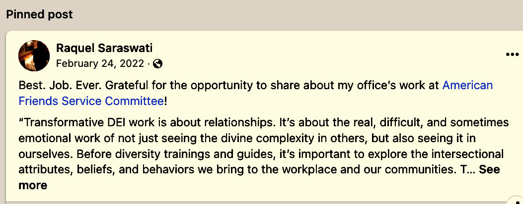 https://theintercept.com/2023/02/16/american-friends-service-committee-raquel-saraswati/. Purported AFSC statement here. They “believe” her. Nothing to “prove.”
