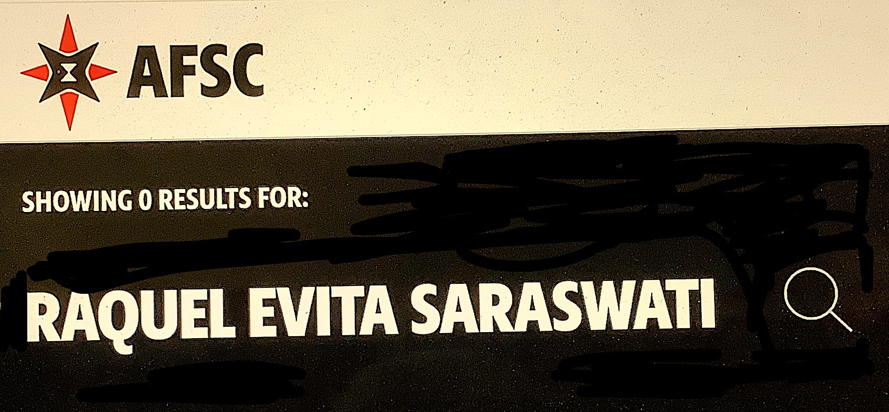 — Second, on the AFSC’s website, which yesterday returned the above screenshot of “0” [as in Zero] search results for Saraswati, now lists “1”, which goes to a profile page about Saraswati as DEI Director.