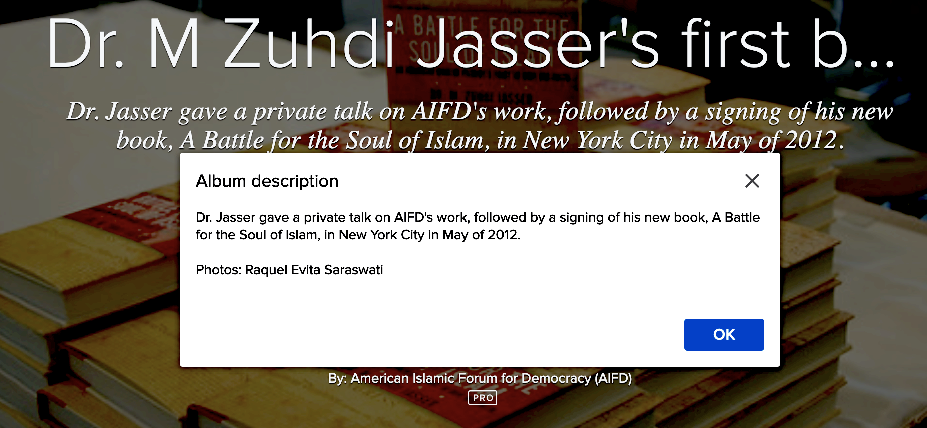 As late as 2012, Saraswati was active in AFID; when Jasser published his first book, A Battle for the Soul of Islam, Saraswati not only attended a book launch party, but also took the photos for AFID’s website.