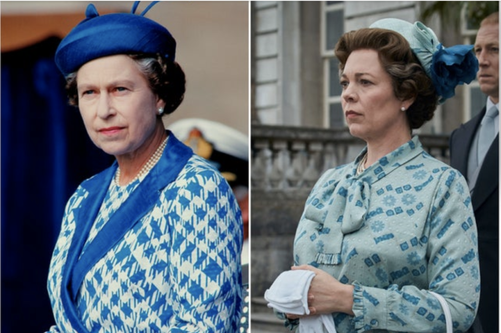 Queen Elizabeth II, in 1986, left. Olivia Colman, right, portrayed her in “The Crown” season four.