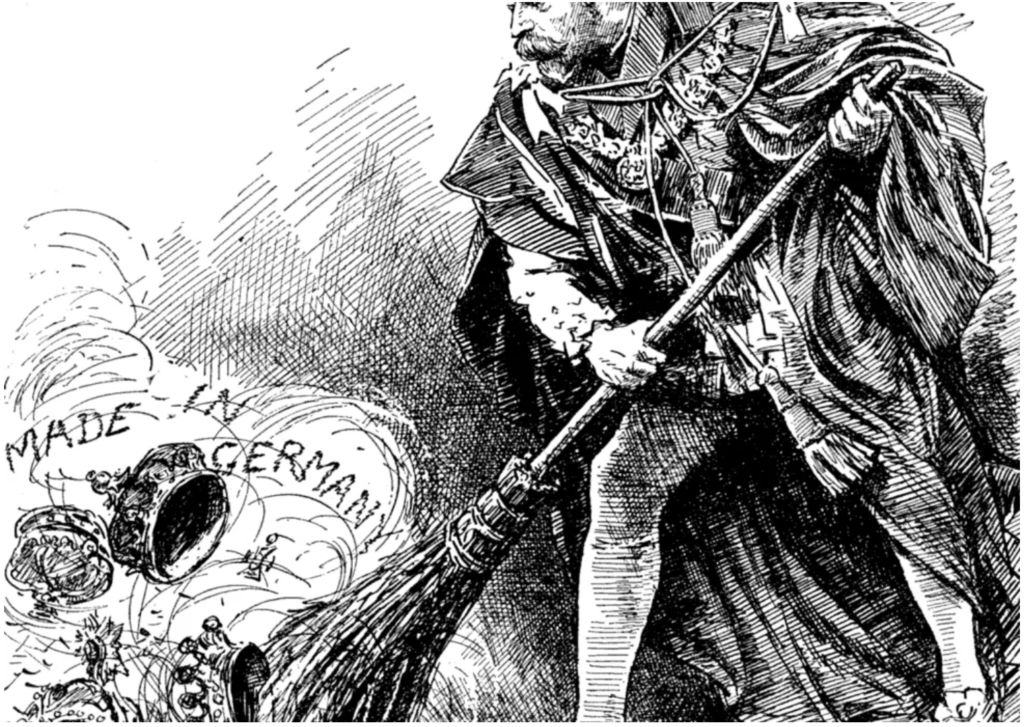 A bit of royal history: the current royal family was originally called the house of Saxe-Coburg-Gotha, all slices of old Germany. Their line was imported into England when Prince Albert married Victoria. Their grandson, George V, changed the royal family name to Windsor in 1917, during World War One, because Saxe-Coburg-Gotha sounded (and indeed was) German. The change is caricatured here.