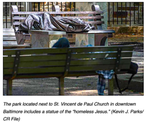 Here’s a landmark snapshot: the historic St. Vincent de Paul Parish has closed the corner park adjacent to its downtown Baltimore church often used by the homeless. The park’s gates have been locked and yellow caution tape has been strung across the church steps. Signs have been posted saying the park has been closed due to vandalism, drug use and drug sales.