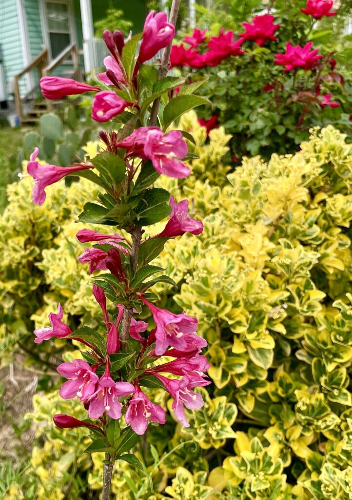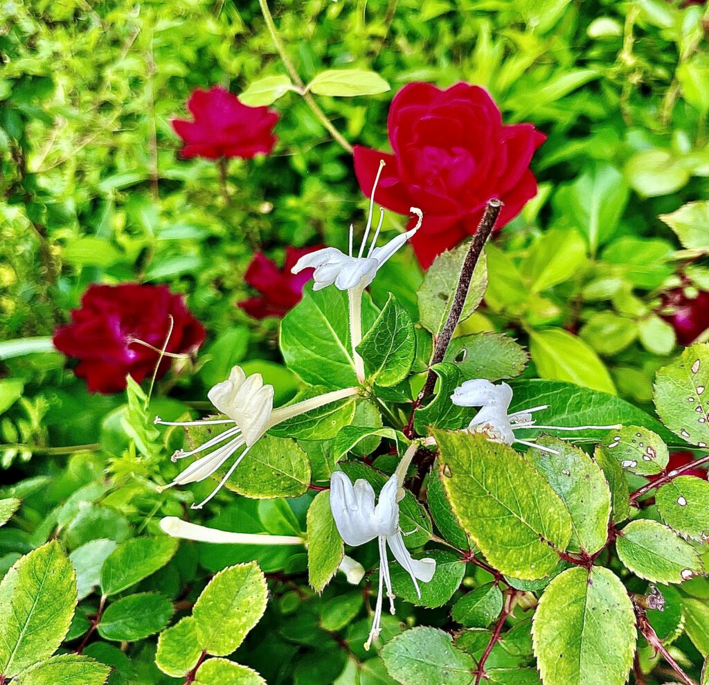 Honeysuckle has just started to appear among the roses. I’m not sure if it’s an invasive variety or not.