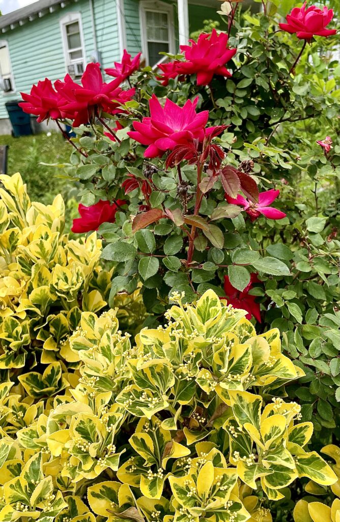 Last but not least, our hardy rose bushes bloom twice a year, and they’re well underway with the spring round.