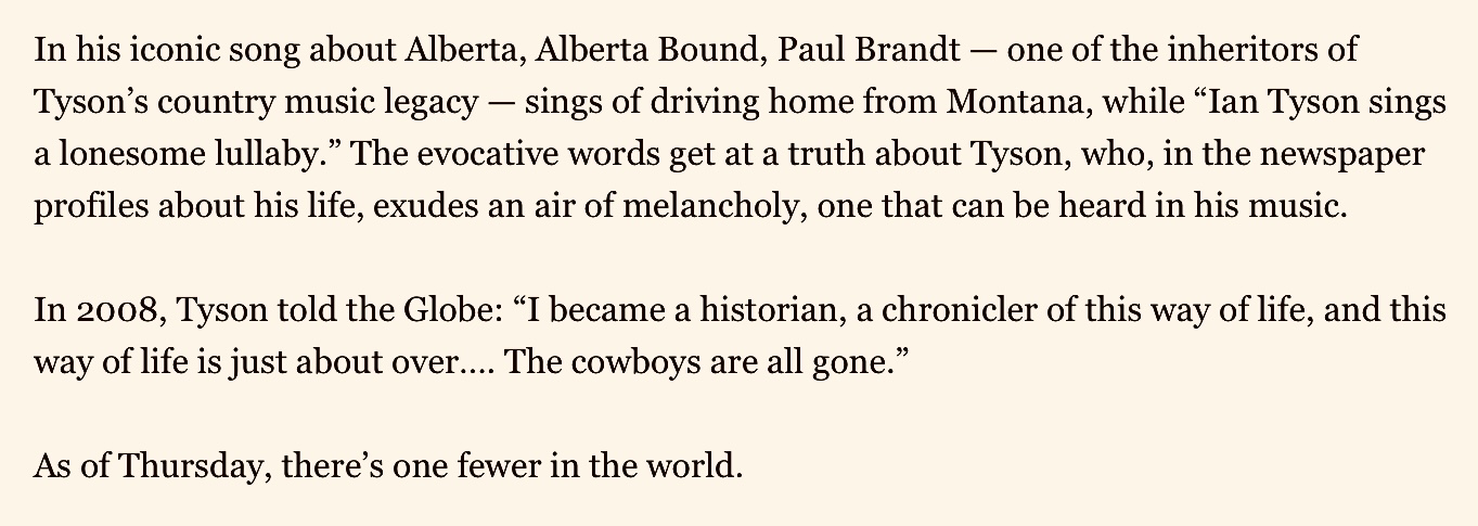 Tyson was a part of the influential folk movement in Toronto with his first wife, Sylvia Tyson. But he was also seen as a throwback to more rustic times and devoted much of his life to living on his ranch and pursuing songs about the cowboy life.