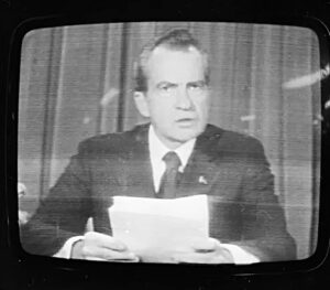 8th August 1974: American president Richard Nixon (1913 – 1994) announces his resignation on national television, following the Watergate scandal. (Photo by Pierre Manevy/Express/Getty Images)
