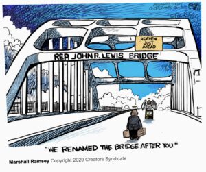 I know the decision will be made by others, mostly younger. But I still carry my memories of standing with Lewis and others when the “Bloody Sunday” March was announced, then crossing the Pettus bridge behind Lewis, more than once. (I was lucky; the clubs & gas were in abeyance for these treks; but the armed federal troops guarding us were very real.)