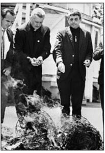 Phil Berrigan, left, and his brother Dan, burning draft files in Catonsville Maryland, May 1968. Both served jail sentences for their witness.