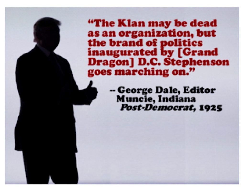 The rise and fall of the 1920s Klan in Indiana (and in the rest of the U.S.) is an epic and gripping story, well worth reading more about. [And shoutout to Spike Lee or other ambitious filmmakers; this is a mother lode of exciting cinematic material!] Yet it’s not so much my subject here. Instead I see it more as a parable that has all too much current resonance. For, whether in white robes or (more likely) not; whether put through the Klan’s laughably ridiculous initiation rites (or more likely not), the Klan agenda of unremitting hostility to new immigrants, especially of color; plus its devotion to the post-Obama-era of repackaged and “sanitized” white supremacy; and its focus on one political party, all are very much still with us.