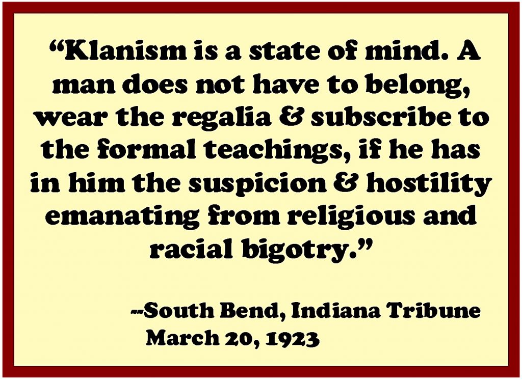 I researched these themes and the images in the summer of 2017. And a key to their resilience came in an obscure editorial in one of the few Indiana newspapers to challenge the Klan. In 1925 when the order was riding high in the state, an unnamed, beleaguered editor in South Bend, prophetically wrote: