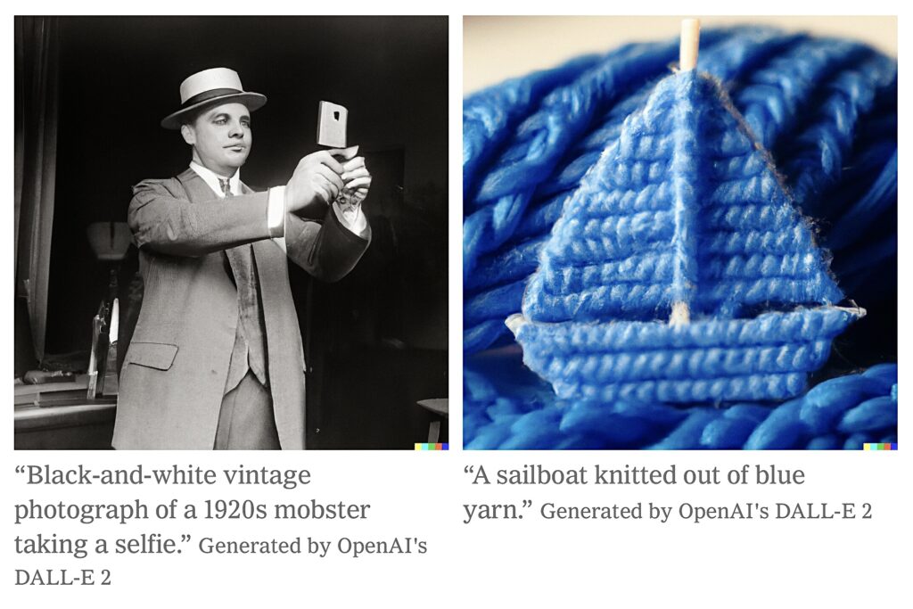 Here, for example, is one of the images DALL-E 2 produced when I typed in “black-and-white vintage photograph of a 1920s mobster taking a selfie.” And how it rendered my request for a high-quality photograph of “a sailboat knitted out of blue yarn.”