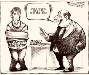 Mandatory arbitration is a corporate stratagem to steer people away from public courtrooms into private, corporate-funded “dispute resolution” — on the corporations’ terms, with arbitrators chosen by them. It is now nearly standard in employment and consumer contracts with big corporations. Thank the Roberts Five for that.
