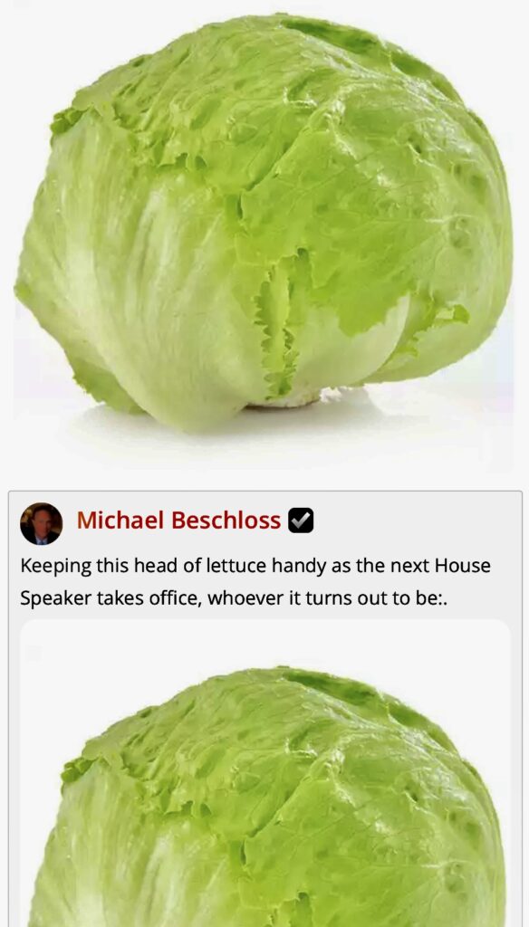 U. S. Update: Michael Beschloss is a noted American political historian. He’s now bought a head of lettuce, wagering it will outlast Rep. Kevin McCarthy’s quest to become Speaker of the U. S. House of Representatives. As of Tuesday night, the lettuce is in the lead.