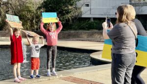 There we met up with a dozen or so genuine Ukrainians, who were just as pleased with the support and the springlike weather, yet who brought a note of seriousness and heightened stakes to the vigil, as when they talked about family in the homeland (and Russia), stood to sing their national anthem, in Ukrainian, and recited a prayer in both that and in English, in which we joined.