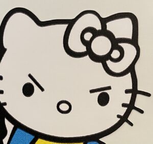 Under a translucent cover sheet, I could make out a version of the internationally popular Hello Kitty image. But when I lifted it, the diminutive feline was wearing a blue and yellow Ukrainian vest, embossed with a black death’s head, toting what looked like an AR-15, and had a steely-eyed expression that banished the “cute-cool” kitten.