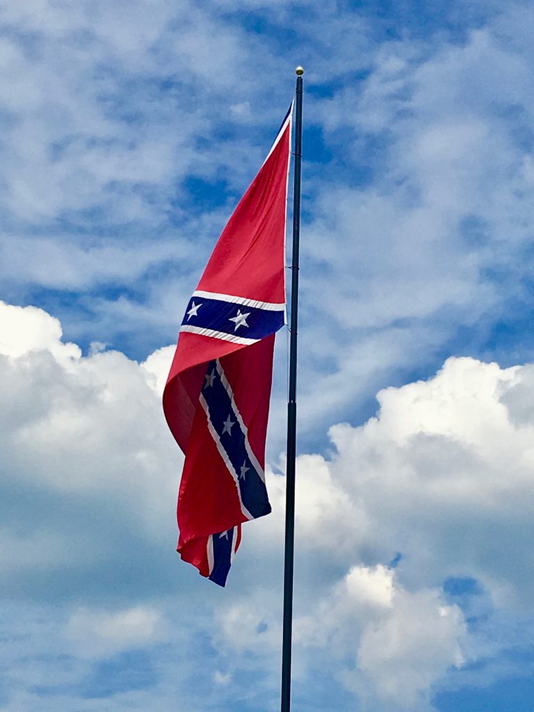 Then a few miles farther there was another of those big confederate flags, this one raised in the center of a field, on a pole at least 60 feet tall; not as big as the Danville banner, but still dominant in its space; also with no signs, no identification.