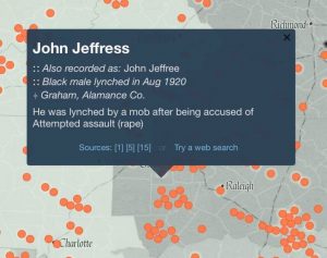 It was from 1920, of one John Jeffress, who was accused of assaulting a white child, and was dragged away from the sheriff by a mob and then shot to death between the town of Graham and Bellemont.